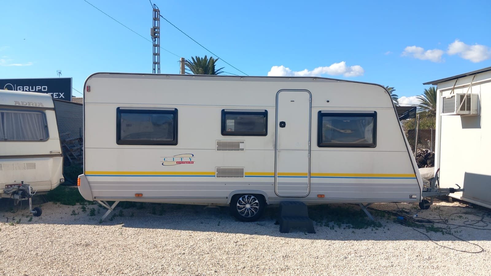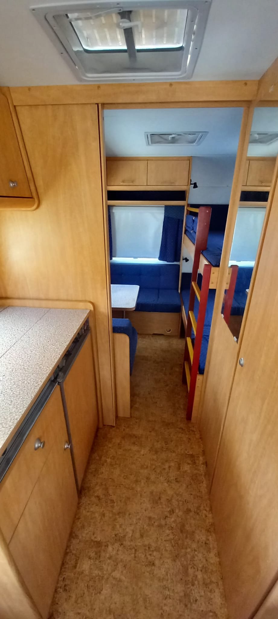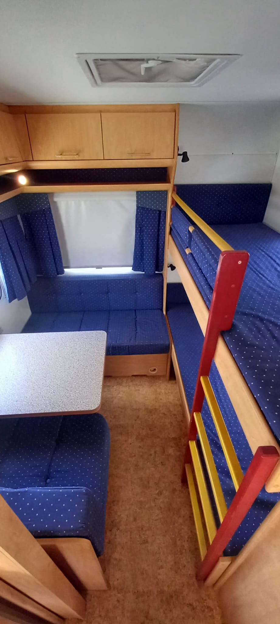 Caravana Burstner City 480 con capacidad para 6 personas. Ideal para escapadas familiares. 3 ambientes distribuidos en, 1 salon comedor rinconera convertible en cama de matrimonio, 1 salon convertible en cama grande y 2 literas amplias, cocina completa y baño completo con wc extraible por el exterior. - Diseño interior espacioso. - Ventanas amplias para luz natural. - Líneas exteriores distintivas en amarillo y azul.Caravana Burstner City 480TK