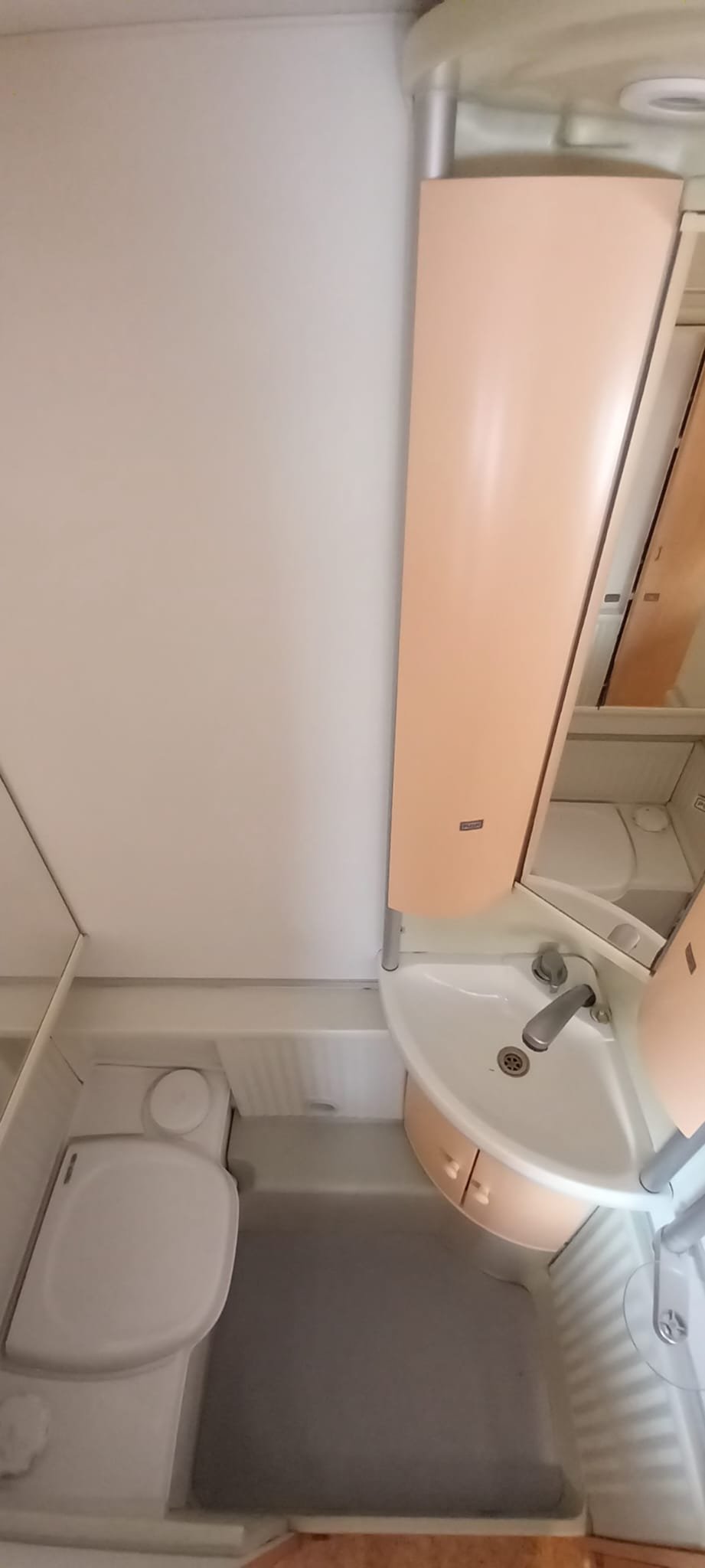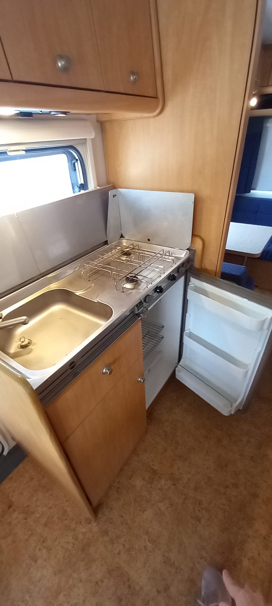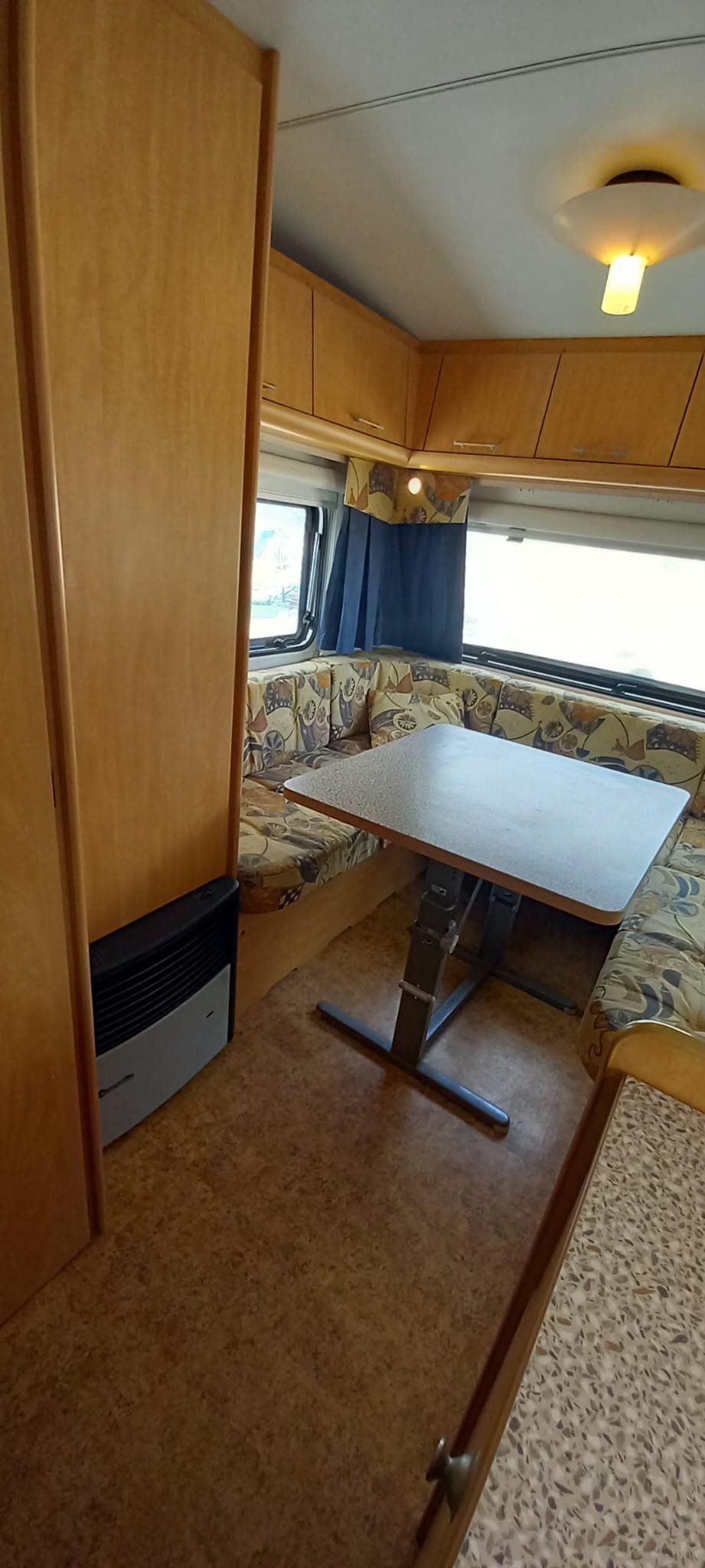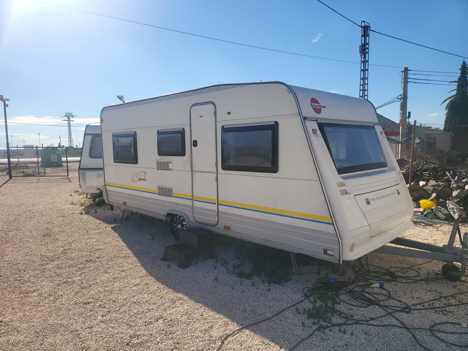 Caravana Burstner City 480 con capacidad para 6 personas. Ideal para escapadas familiares. 3 ambientes distribuidos en, 1 salon comedor rinconera convertible en cama de matrimonio, 1 salon convertible en cama grande y 2 literas amplias, cocina completa y baño completo con wc extraible por el exterior. - Diseño interior espacioso. - Ventanas amplias para luz natural. - Líneas exteriores distintivas en amarillo y azul.Caravana Burstner City 480TK