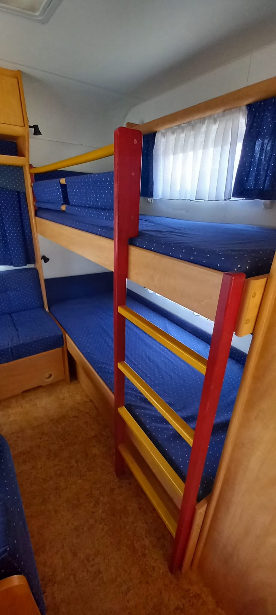 Caravana Burstner City 480 con capacidad para 6 personas. Ideal para escapadas familiares. 3 ambientes distribuidos en, 1 salon comedor rinconera convertible en cama de matrimonio, 1 salon convertible en cama grande y 2 literas amplias, cocina completa y baño completo con wc extraible por el exterior. – Diseño interior espacioso. – Ventanas amplias para luz natural. – Líneas exteriores distintivas en amarillo y azul.