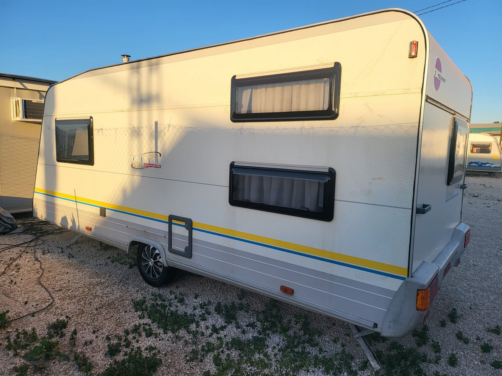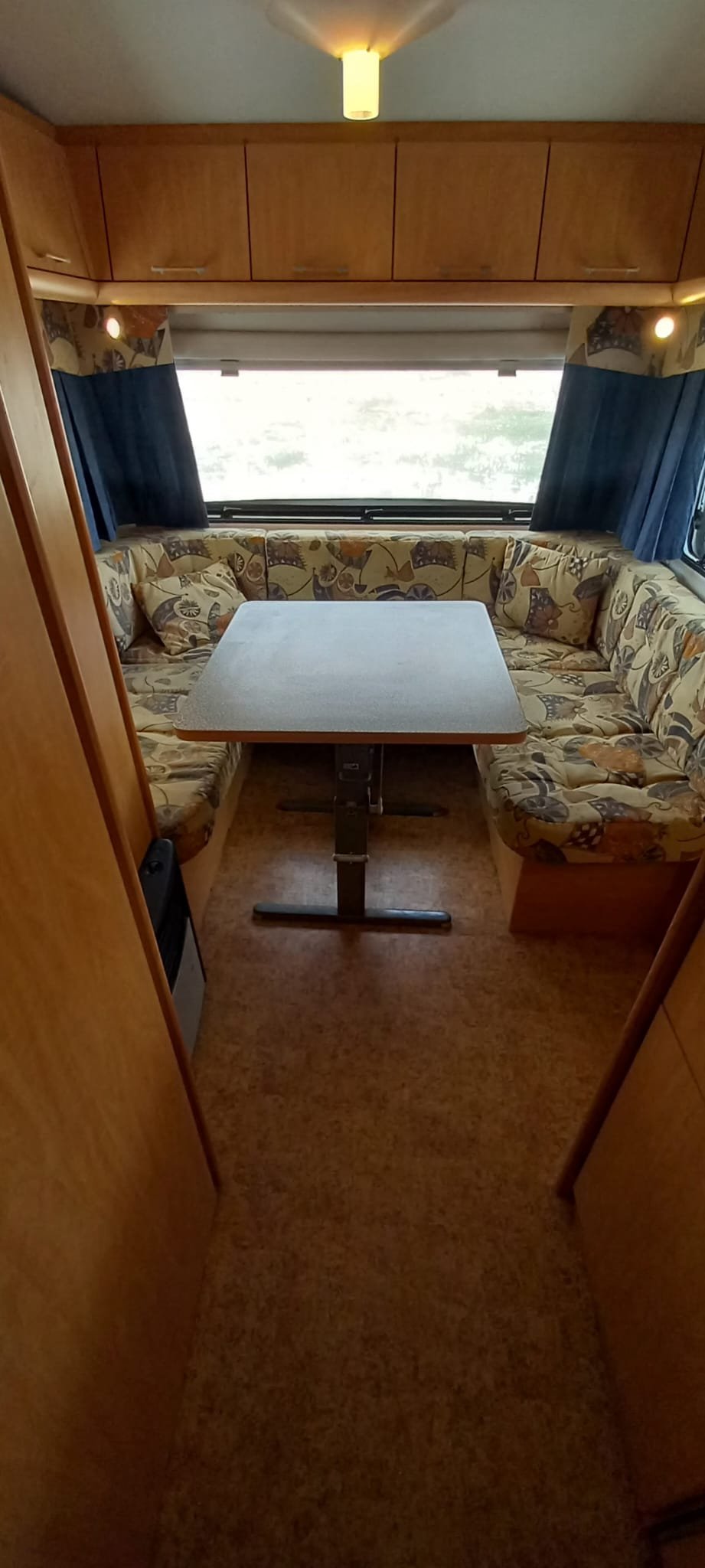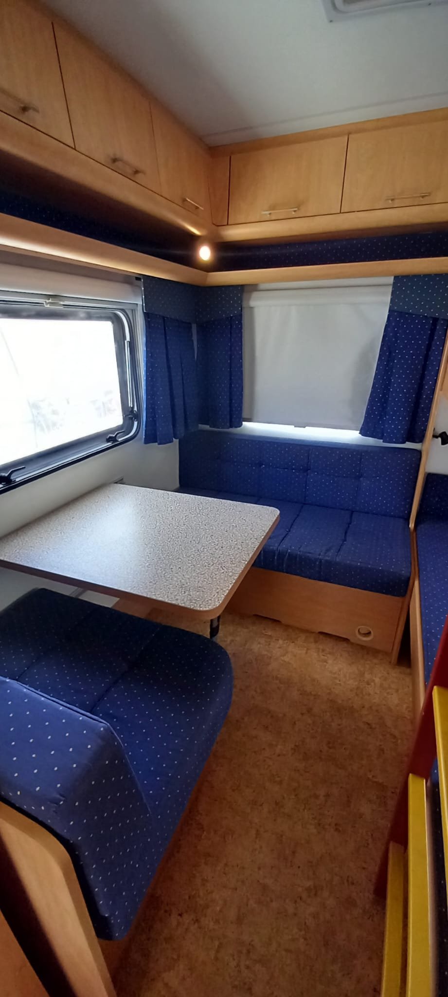Caravana Burstner City 480 con capacidad para 6 personas. Ideal para escapadas familiares. 3 ambientes distribuidos en, 1 salon comedor rinconera convertible en cama de matrimonio, 1 salon convertible en cama grande y 2 literas amplias, cocina completa y baño completo con wc extraible por el exterior. – Diseño interior espacioso. – Ventanas amplias para luz natural. – Líneas exteriores distintivas en amarillo y azul.